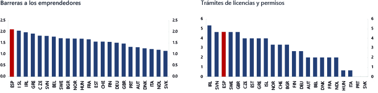 Regulación del Mercado. Índice escala de 0 a 6 de menos a más restrictivo. España (en color rojo) siempre a la cabeza en barreras, trabas, licencias y permisos.
