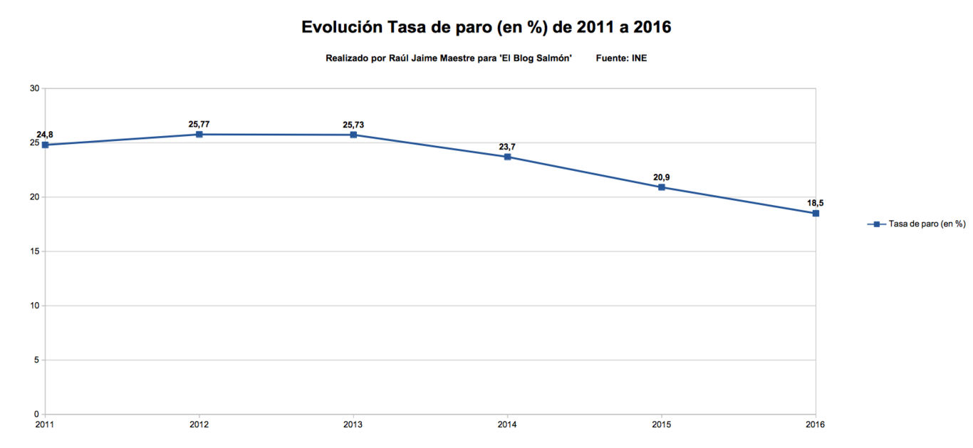La reforma laboral se realizó en plena recesión y con objetivo de cambiar la flexibilidad externa en las empresa por una flexibilidad interna. Esto quiere decir menos destrucción de empleo cuando llegan las crisis con más reducciones de salarios como se puede ver e la gráfica “Evolución tasa de paro de 2011 a 2016”: