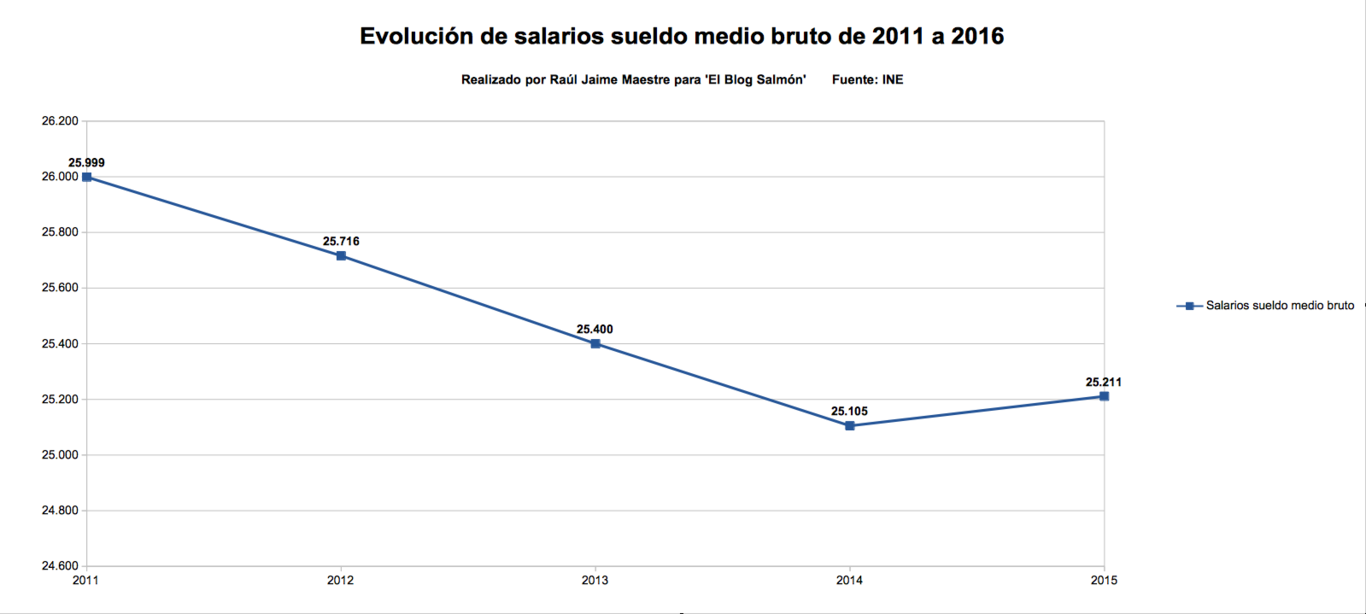 Todos estos cambios ha propiciado la disminución de los salarios como se puede ver en la gráfica de “Evolución de salarios sueldo medido bruto de 2011 a 2016′:
