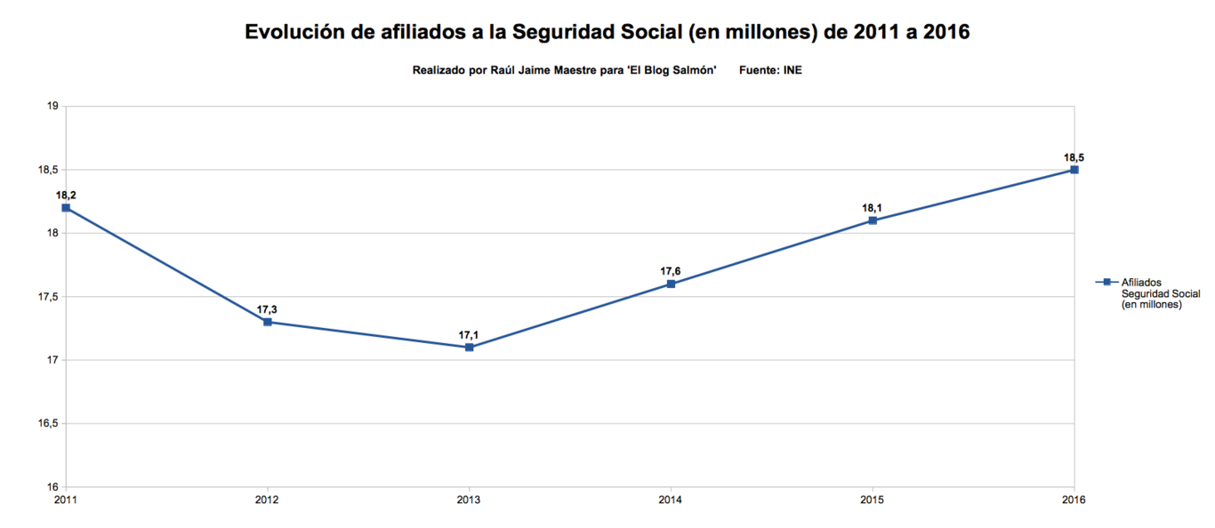 Desde entonces se han ido encadenando más de 2 años en los que el saldo anual supera los aumentos de 400.000 puestos de trabajo como se puede ver en la gráfica “Evolución de afiliados a la Seguridad Social de 2011 a 2016”: