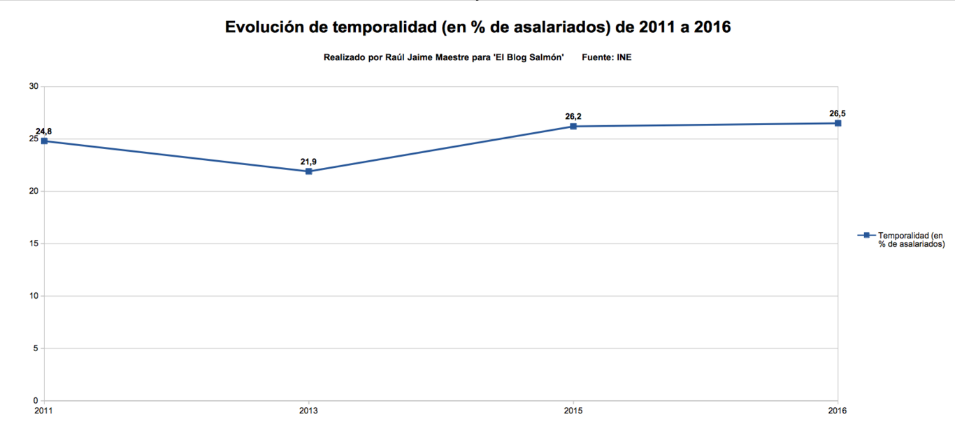 Pero este crecimiento tiene su lado negativo. El trabajo que se está creando es precario y poco productivo, siendo un de los grandes males la temporalidad como se puede ver en la gráfica “Evolución de temporalidad de 2011 a 2016”: