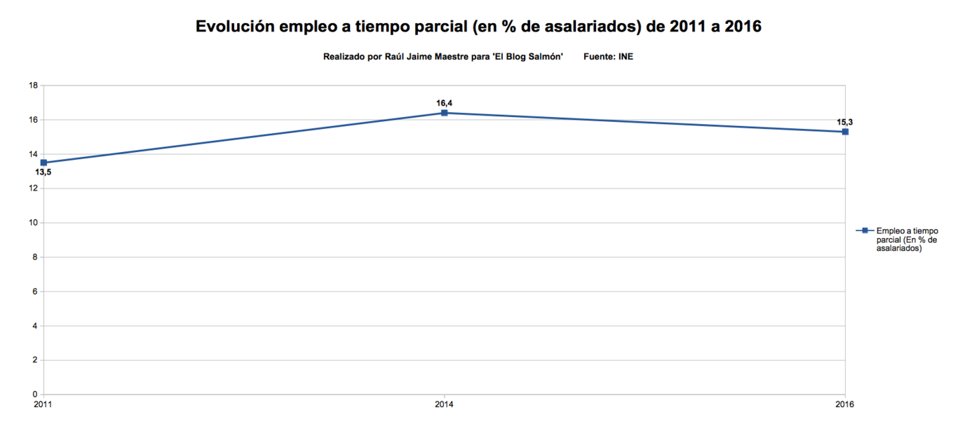 Y también se ha dado un incremento en los contratos a tiempo parcial desde la entrada en vigor de la reforma laboral como se puede ver en la gráfica “Evolución empelo a tiempo parcial de 2011 a 2016”:
