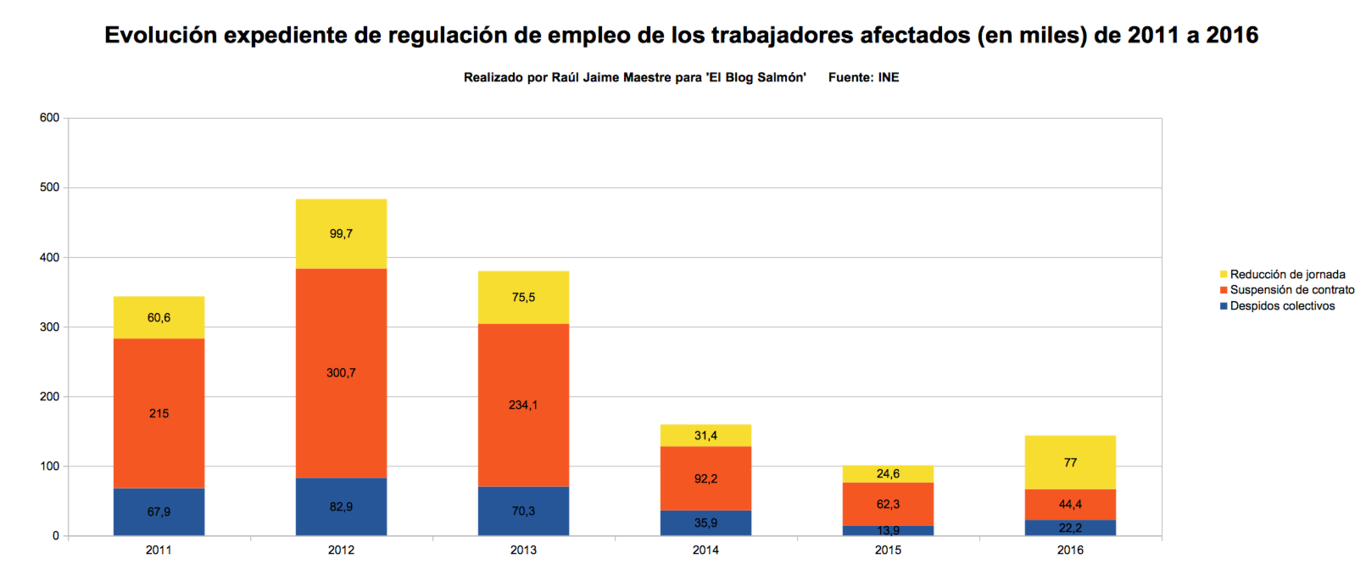 Aquí se ha fracasado o la incidencia fue mínima como se puede ver en la gráfica “Evolución expedientes de regulación de empleo de los trabajadores afectados de 2011 a 2016”: